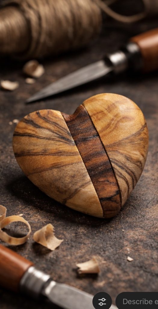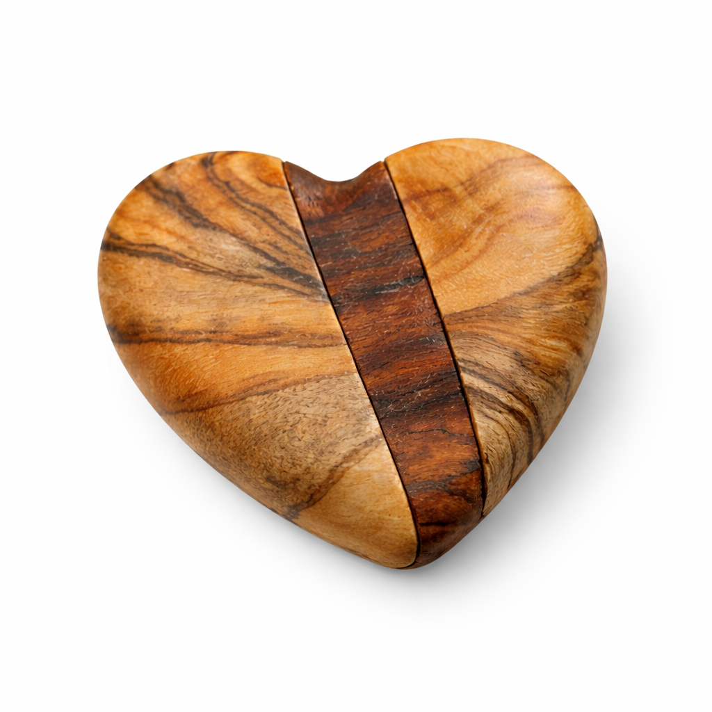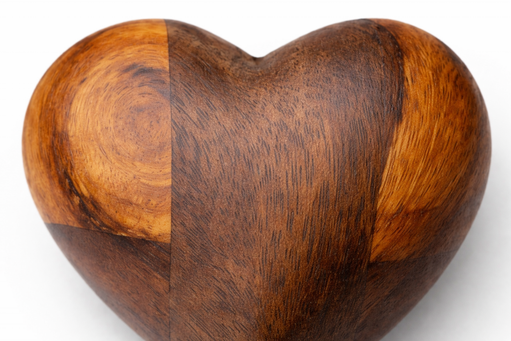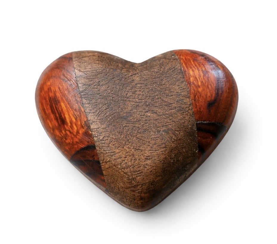 Some Ironwood hearts are composed of multiple hardwood segments joined before carving begins. The form is shaped after assembly, allowing the grain patterns to emerge naturally through the carving process.